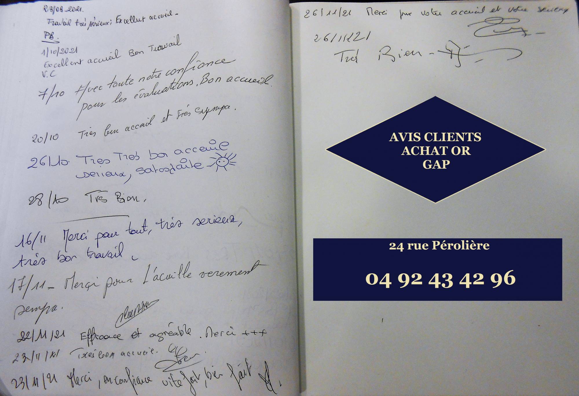 Les avis clients sur le site Quel rachat d'or.com sont les avis laissés par nos clients dans le livre d'or de notre comptoir de rachat et vente d'or GAP, écrits et signés de leur main.