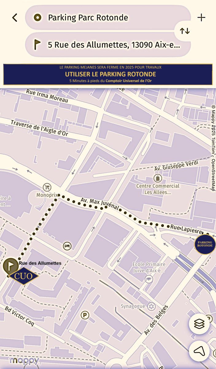 La fermeture pour travaux du parking Méjanes en 2025 n'est que passagère et ne vous empêchera pas de profiter du Comptoir Universel de l'Or Aix en Pce pour acheter ou vendre votre or dans notre comptoir de rachat d'or Aix noté 5 étoiles par ses clients